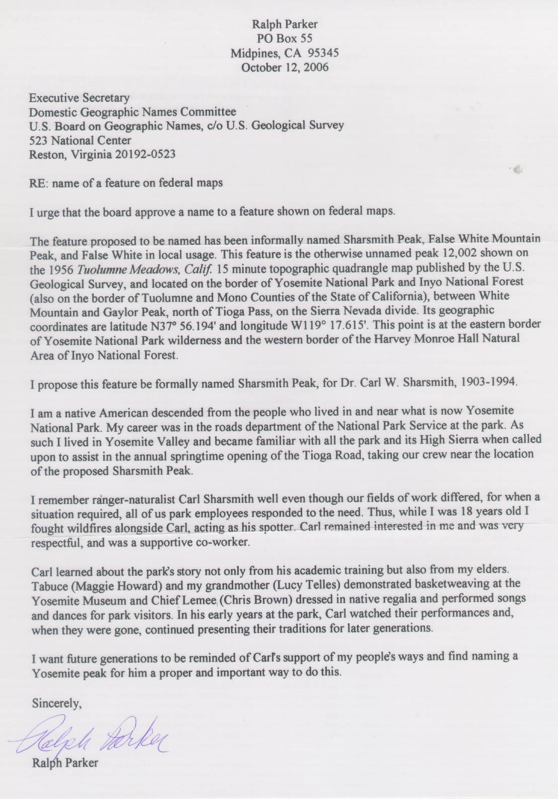 Ralph Parker. Native American from Yosemite region, retired road foreman, Yosemite National Park. Based in Midpines, California